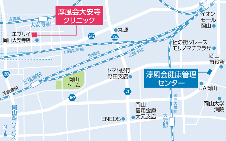 - CT検査、MRI検査等を含む健診や通常の人間ドックは、これまで通り淳風会健康管理センター(岡山市北区大供)で受診ください。