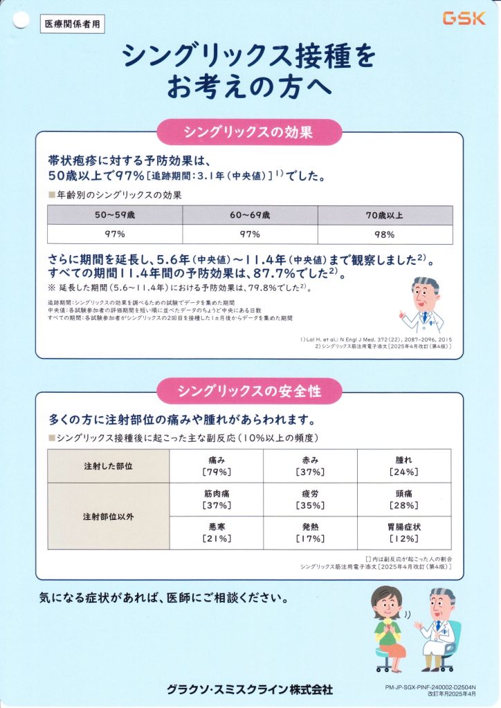 不活化ワクチン(シングリックス)は効果が高い分、副反応も出やすい傾向にあります。
