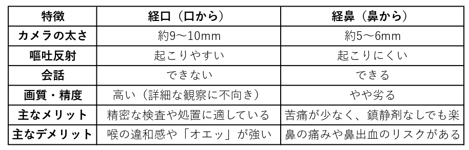 ・経口がおすすめの人: 鼻腔が狭い人、鼻血が出やすい人、鎮静剤(麻酔)を使って眠った状態で精密な検査を受けたい人。