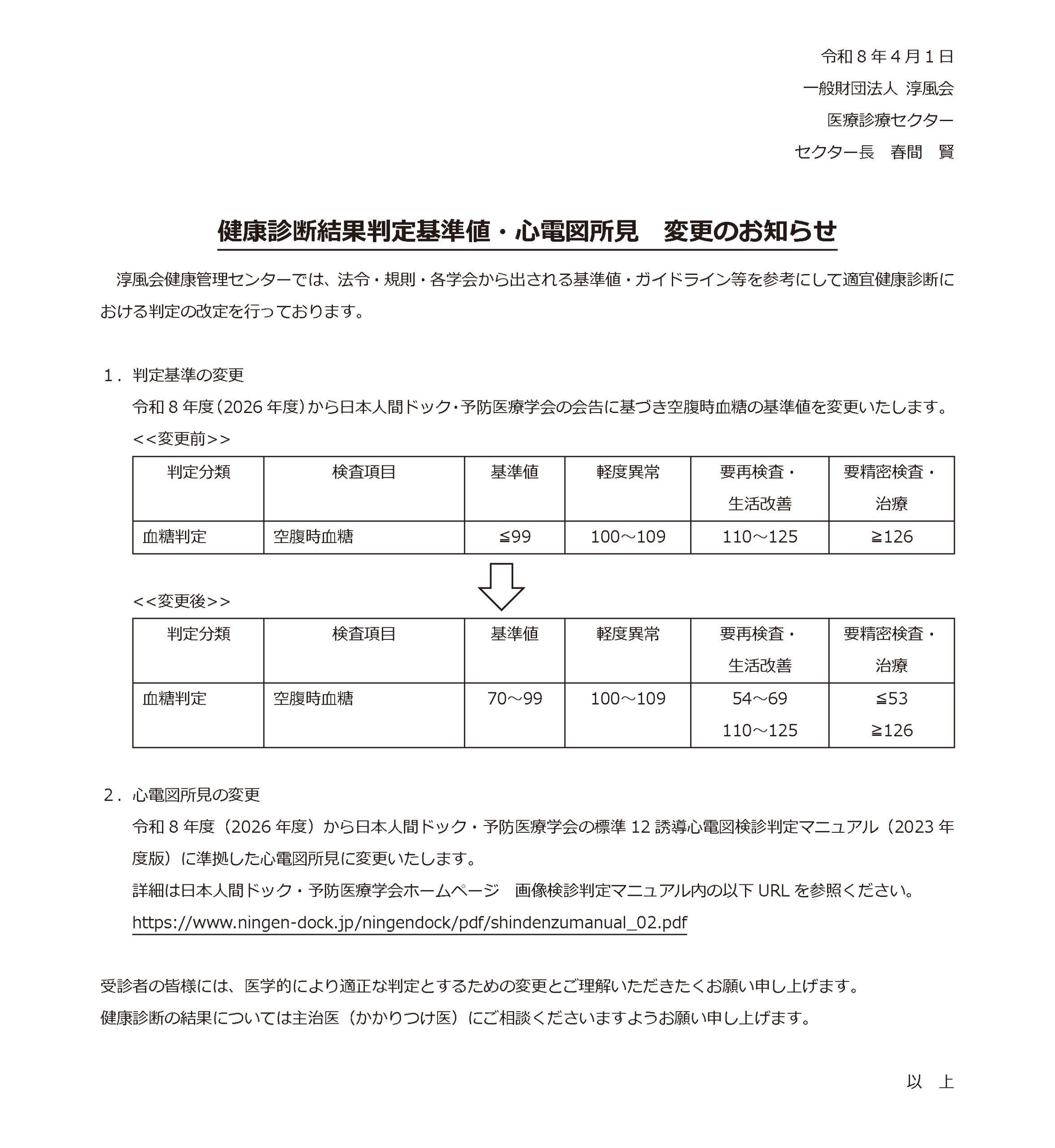 健康診断結果判定基準値・心電図所見変更のお知らせ