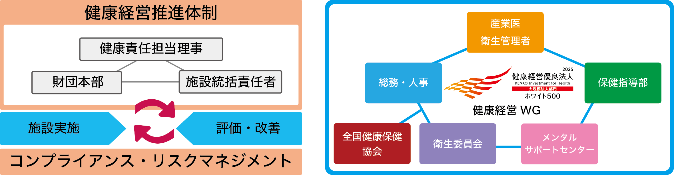 健康づくり、ポジティブメンタルヘルスの取り組みにより、職員の心身の健康とエンゲージメントを向上し、業務パフォーマンスの向上を目指します。同時に、職員の健康と幸福の実現を目指します。